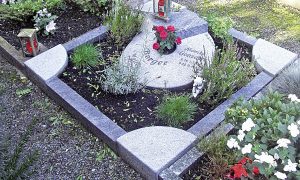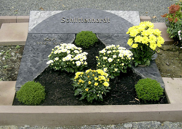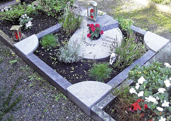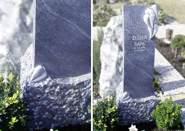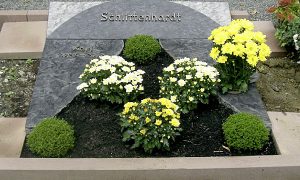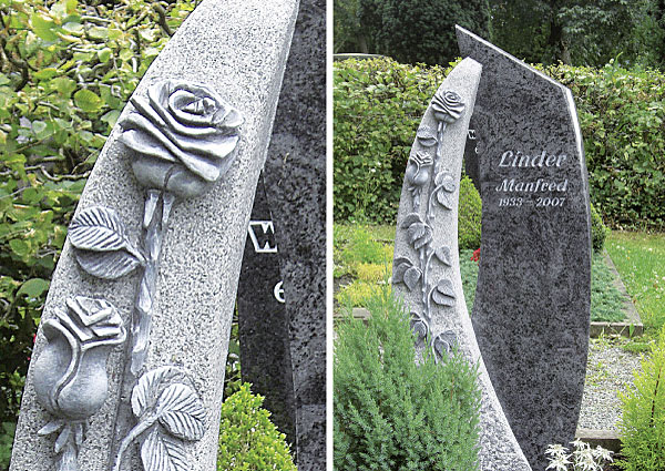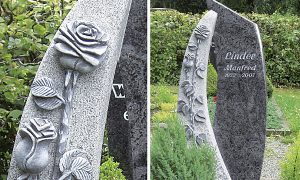 Urnengrab Oreon-Gneis mit geschwungener Abdeckplatte mit Pflanzen-Ausschnitt.