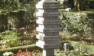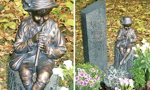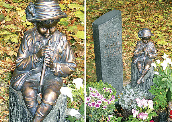 Ein Flötenspieler aus Bronze verziert das Grabmal.
