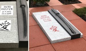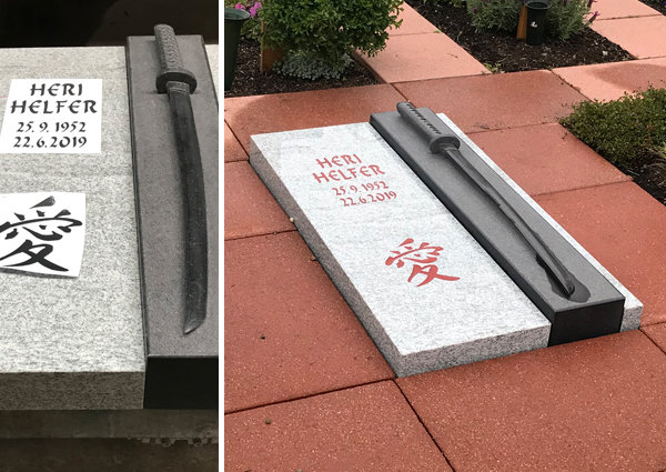 Abdeckplatte aus Viscont white Gneis, Schwert aus einem Stück in schwarzem Granit herausgehauen. Verstorbener war Samureischwertkampf-Trainer.