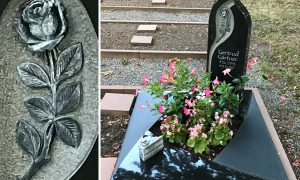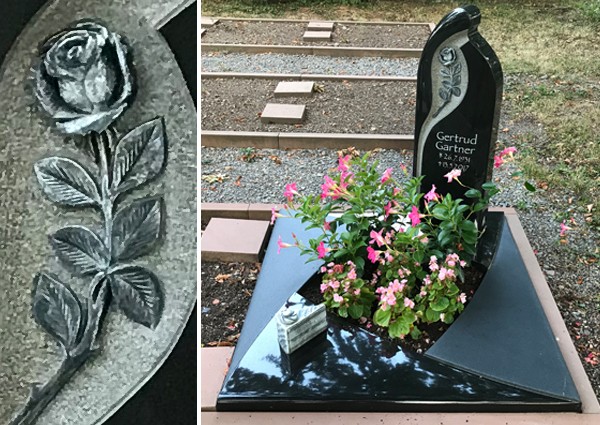 schwarzer Granit Abedeckplatte mit Pflanzenausschnitt. Verstorbene backte für ihr Leben gern Torten, deshalb ein Tortenstück in Stein handwerklich bearbeitet, vorne links angebracht.